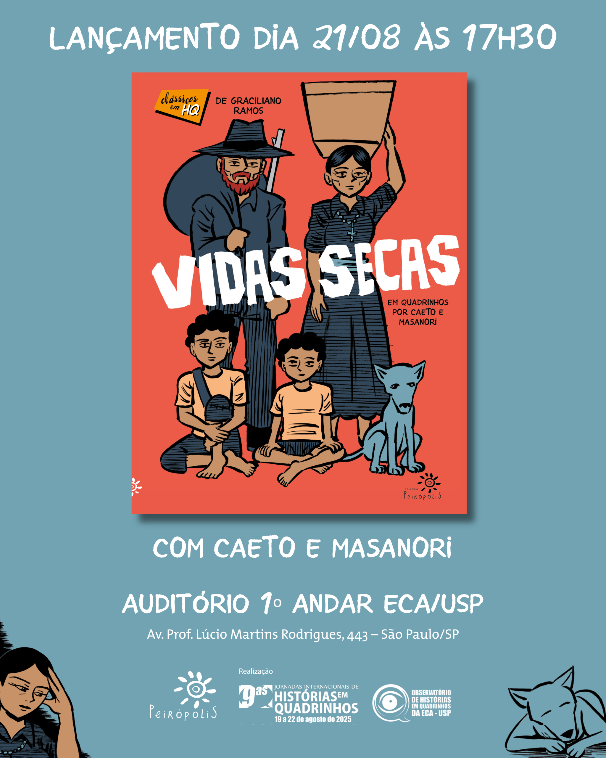 A Editora Peirópolis convida para o lançamento oficial da graphic novel Vidas Secas, adaptação do clássico de Graciliano Ramos pelos quadrinistas Caeto e Masanori Ninomiya, que acontecerá no dia 21 de agosto, às 17h30, durante as Jornadas Internacionais de Histórias em Quadrinhos da ECA-USP.