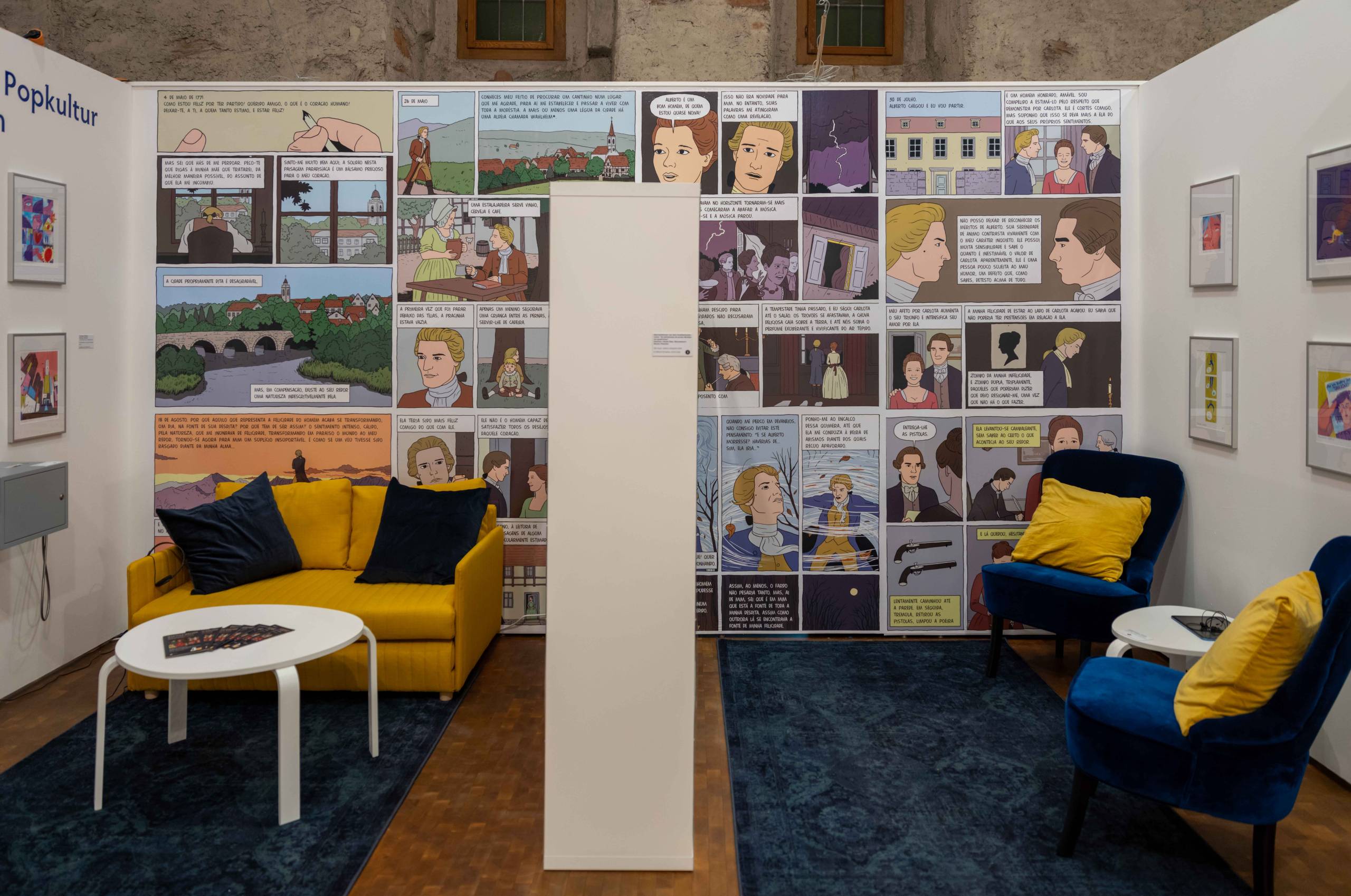 Em 2024, a obra de Johann Wolfgang von Goethe, Os sofrimentos do jovem Werther completa 250 anos. Para comemorar, os Museus Municipais de Wetzlar (@museen.wetzlar), cidade alemã onde se passa a história, estão realizando ao longo do ano uma série de eventos. Uma das principais atrações é uma exposição com diversas adaptações de Werther, de várias partes do mundo, que seguirá até 2025. Entre os destaques da exposição está a versão em quadrinhos de Os sofrimentos do jovem Werther, criada por Daniel Gisé, com ilustrações projetadas nas paredes.Na adaptação de Gisé, as descrições e relatos do protagonista Werther foram transformados em cenas de ação e diálogos, conferindo dinamismo característico das histórias em quadrinhos. As cores desempenham um papel essencial, variando entre tons quentes e frios para representar as emoções. O romance de Goethe, publicado originalmente em 1774, é um marco do Romantismo alemão, movimento que valoriza a expressão emocional, a imaginação e a individualidade. A obra apresenta o jovem Werther, introspectivo e emotivo, que, por meio de cartas a um amigo, narra sua paixão arrebatadora e trágica. Com forte teor autobiográfico, o livro expressa as angústias da juventude da época, sentimentos que reverberam em todas as gerações, como a busca pelo autoconhecimento e o desejo de encontrar um lugar autêntico na sociedade.