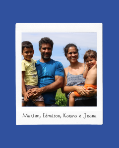 Karina Ferro e Edmilson Prado: Produzir juntos o livro Pia o pio, pia Martim é de fato uma expressão da nossa parceria. Nós dois trazemos – de nossas famílias e de nossas vivências – experiências de vida e conhecimentos muito distintos e que se complementam de diferentes formas em nossa convivência. Eu nasci e cresci na cidade, estudei muito as palavras e aprendi a brincar com elas. Edmilson nasceu e cresceu na Comunidade Rio Verde e Grajaúna, território caiçara, e carrega consigo o conhecimento ancestral da comunidade sobre a vida nesse lugar. O Martim e a Joana, nossa filha mais nova, também são fruto dessa parceria e trazem com eles essa história.