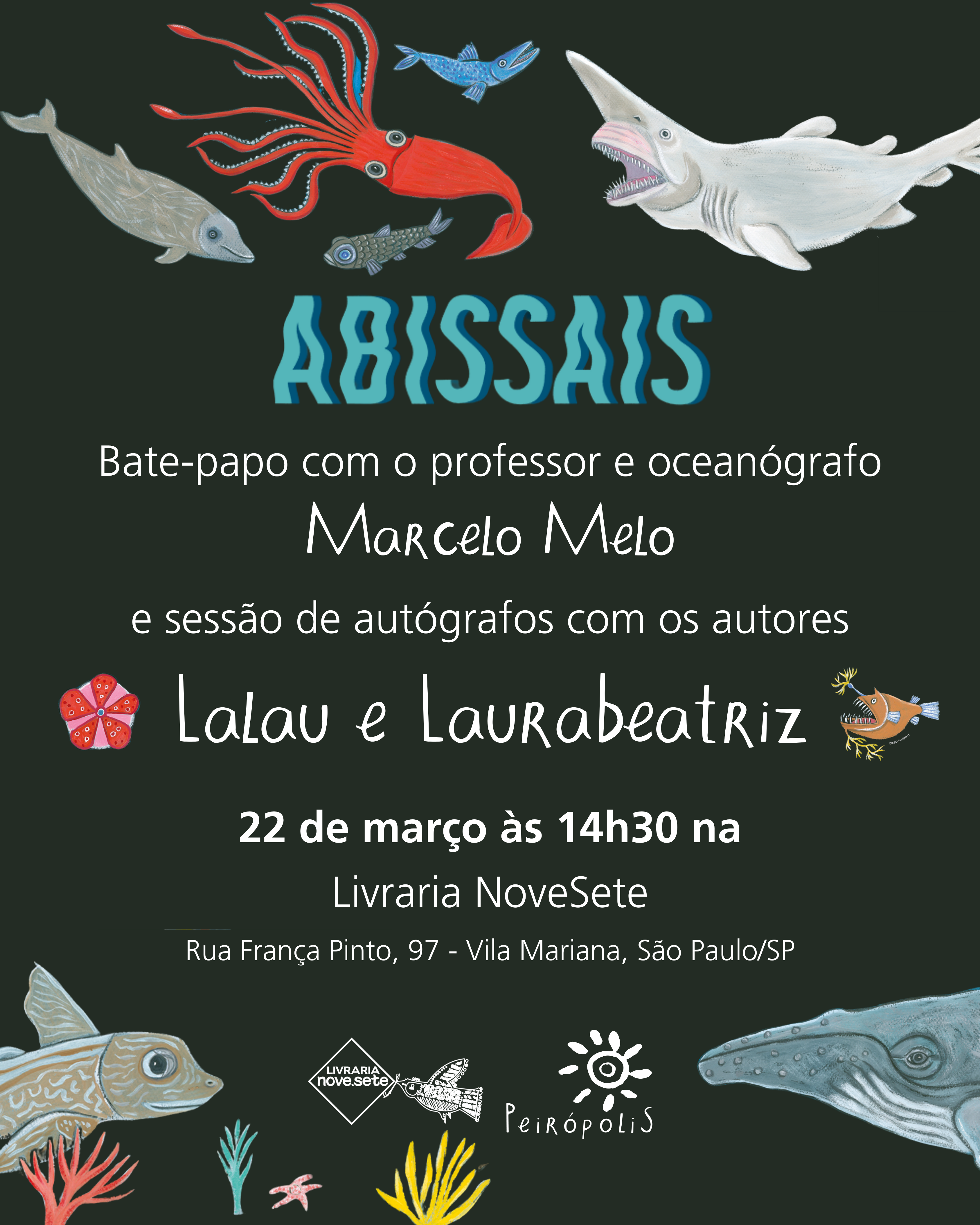 O evento de lançamento acontece no dia 22 de março na Livraria NoveSete, em São Paulo/SP e contará com um bate-papo com o professor e oceanógrafo da USP Marcelo Melo, que levará materiais para que crianças e adultos conheçam os mistérios do oceano profundo. O lançamento também contará com sessão de autógrafos com os autores Lalau e Laurabeatriz.